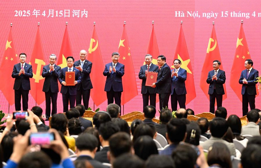 Chinese President Xi Jinping, also general secretary of the Communist Party of China (CPC) Central Committee, General Secretary of the Communist Party of Vietnam Central Committee To Lam and Vietnamese Prime Minister Pham Minh Chinh jointly witness the launching ceremony of the China-Vietnam railway cooperation mechanism at the International Convention Center in Hanoi, capital of Vietnam, April 15, 2025. [Photo/Xinhua]